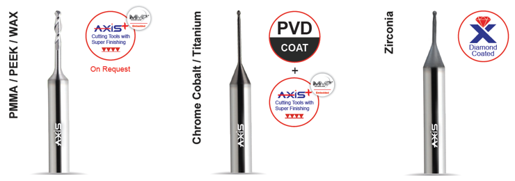 AXISのデンタル用ミリングバーは、主要メーカーのミリングマシンに幅広く対応し、歯科ラボでの多様なニーズに応えます。耐摩耗性に優れたダイヤモンドコーティングを採用することで、工具寿命を大幅に延長。交換頻度を抑えることで、トータルコストを削減します。